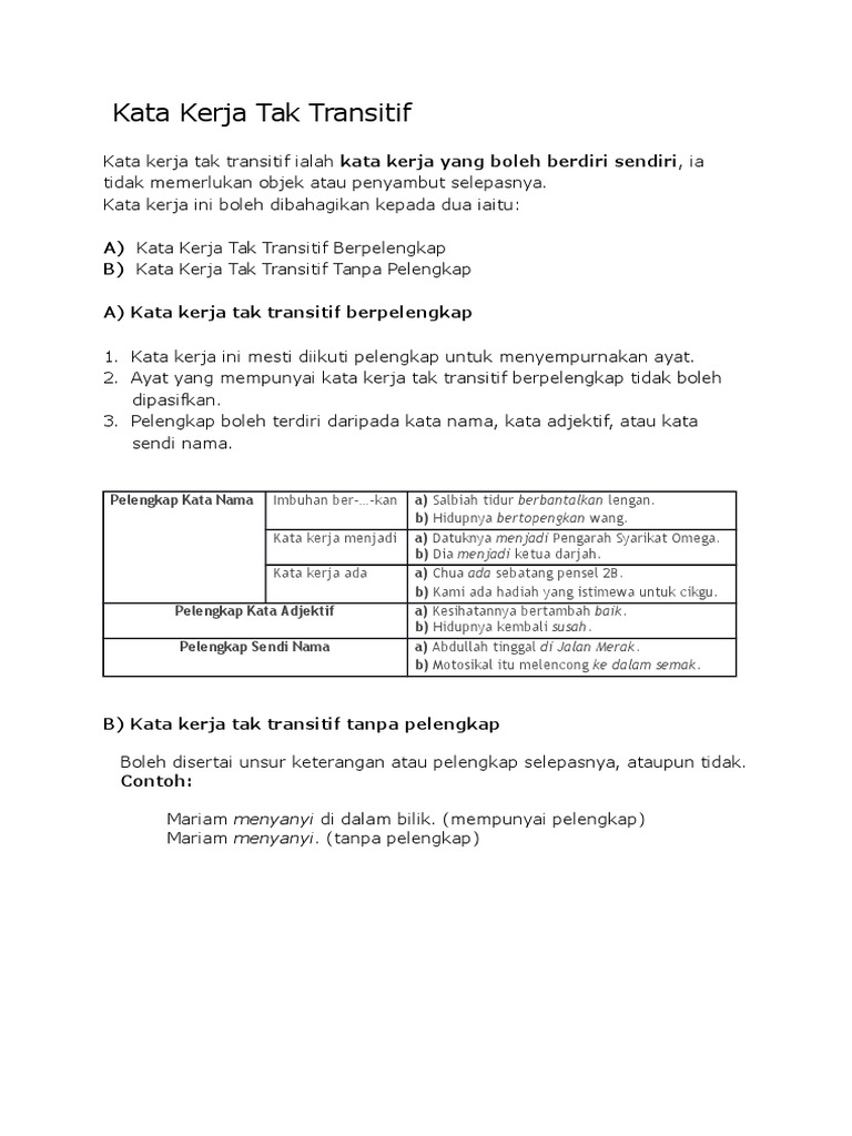 Kata kerja transitif ialah kata kerja yang mesti diikuti oleh objek yang terdiri daripada frasa nama sebagai predikat dalam ayat. Lengkapkan ayat dengan kata kerja yang betul. Kata kerja tak transitif yang tak berpelengkap. Kata kerja tak transitif ( perbuatan tidak melampau ). Kata kerja tak transitif kata kerja tak transitif ialah kata kerja yang sempurna maknanya dengan tidak memerlukan objek.