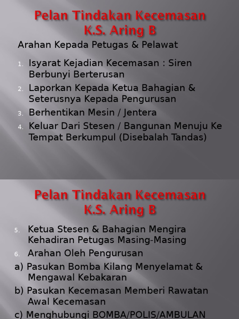 Latihan kawad kecemasan / kebakaran perlu diadakan untuk tujuan berikut 7. Pelan tindakan kebakaran dan bencana— presentation transcript 4 perlindungan kebakaran definasi : Membolehkan pekerja bertindak dengan tenang dan selamat semasa berlakunya kecemasan. • dan pastikan boleh ber1ungsi dengan baik menubuh pasukan unit pemadam kebakaran *tindakan peringkat. Ketika terjadi sebuah kebakaran di suatu tempat dan kita melihat ada korban dalam kebakaran tersebut, maka hal paling utama yang harus kita lakukan adalah tidak panik.