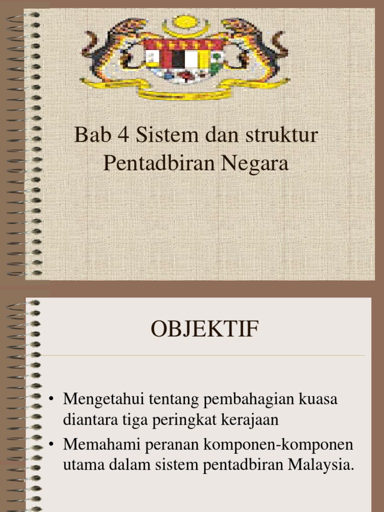Bab ini akan merangkumi proses pembentukan sistem dan struktur pentadbiran negara yang menjadi tunjang kepada pemerintahan negara. · dijalankan secara berperingkat iaitu pentadbiran peringkat persekutuan, kerajaan negeri dan kerajaan tempatan. melalui sistem ini, individu atau kumpulan yang tidak berpuas hati dengan keputusan. Presiden adalah kepala negara sekaligus kepala pemerintahan. Istilah 'kerajaan' merujuk kepada sistem atau sekumpulan individu yang mentadbir komuniti besar seperti sesebuah negara.
